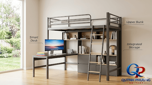 Giường tầng sắt kết hợp bàn làm việc/tủ đồ: Một giải pháp “3 trong 1” cực kỳ thông minh cho các bạn trẻ độc thân hoặc gia đình có con nhỏ. Tầng trên là nơi ngủ, tầng dưới được biến tấu thành không gian học tập hoặc lưu trữ đồ đạc.