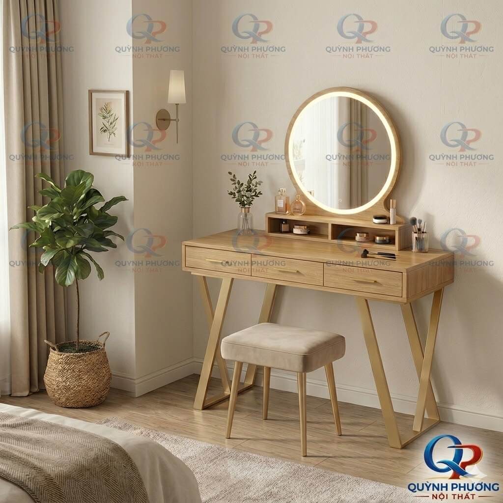 - Tiện ích: Có 2 ngăn kéo lớn và kệ nhỏ trên mặt bàn để sắp xếp mỹ phẩm gọn gàng.